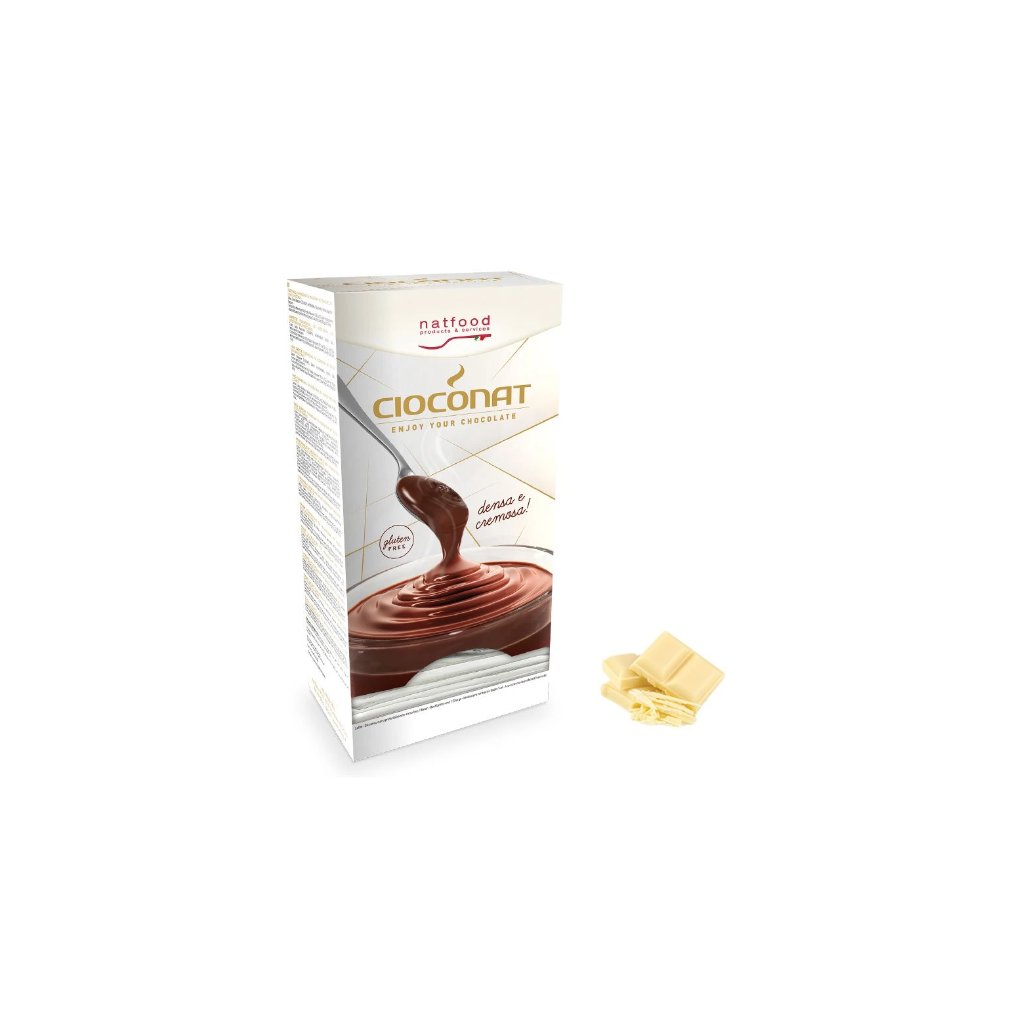 Složení: Cukr, kukuřičný škrob, kakaové máslo v prášku (kakaové máslo, sušené odstředěné mléko, stabilizátor:E450), vločky bílé čokolády 10,24% (cukr, kakaové máslo 24,8%, plnotučné mléko v prášku 14,9%, laktóza, syrovátkový prášek,emulgátor: slunečnicový lecitin, přírodní vanilkové aroma),smetana v prášku (smetana, odtučněné mléko, stabilizátor: E450), aromata, zahušťovadlo: E417, sůl, barviva: E100 (kurkumin), E160a (beta-karoten).Vyrobené v továrně, která zpracovává sóju, mléko a ořechy. Bez lepku.
